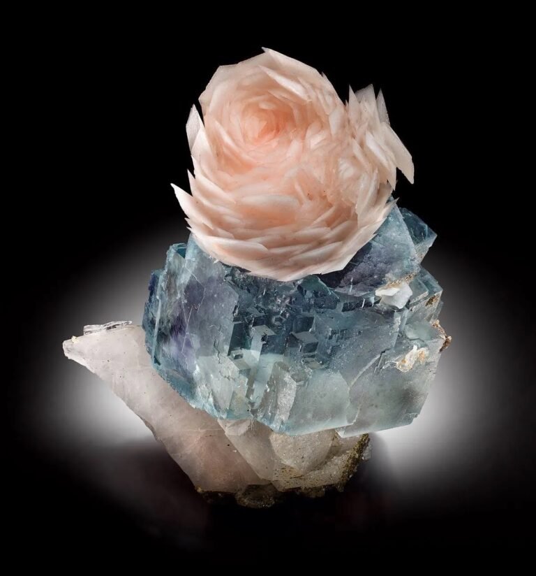 | バラのような色をした方解石!中国、耀岡県産。蛍石の上にバラの形をした方解石の花が咲いています。地球全体でもごく少数しか発見されておらず、しかも中国でのみ発見されています。まさに自然史における完璧な芸術作品と言えるでしょう。 |